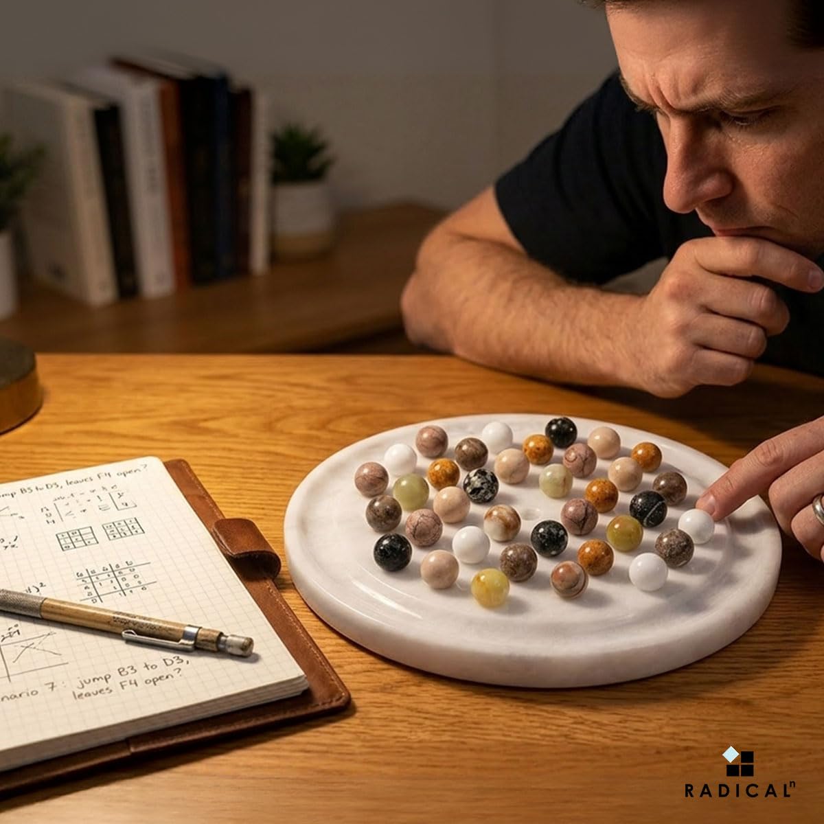 - MARBLE SOLITAIRE SET - Includes 1x peg solitaire board game with multicolored marble balls, thoughtfully presented in RADICALn secure, branded fragile packaging that arrives ready to display for discerning solitaire enthusiasts.