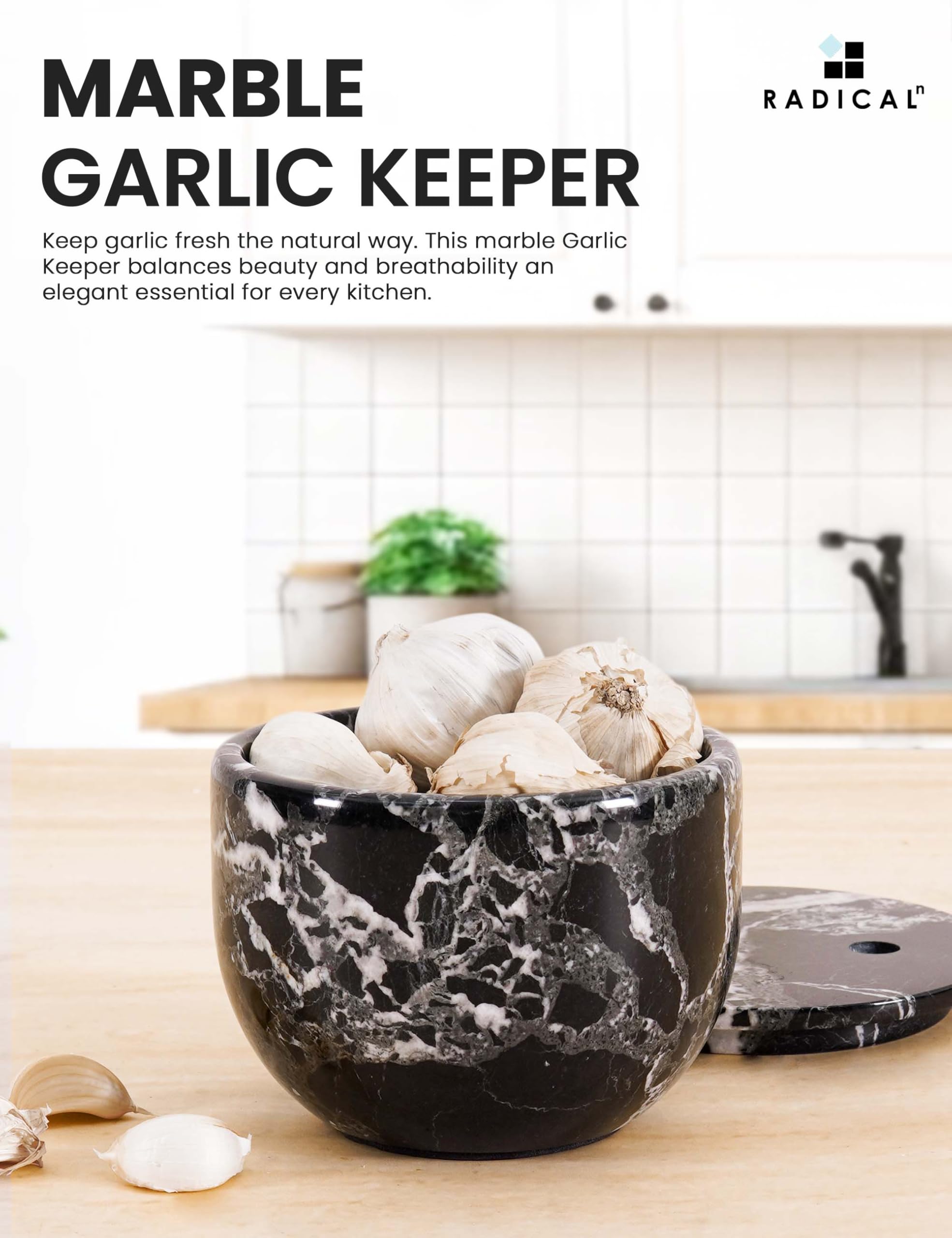 - MARBLE GARLIC KEEPER FOR COUNTERTOP - 1x Garlic Holder. Carefully packed in secure, protective, and RADICALn fragile-safe packaging to ensure your garlic container arrives in perfect condition.
