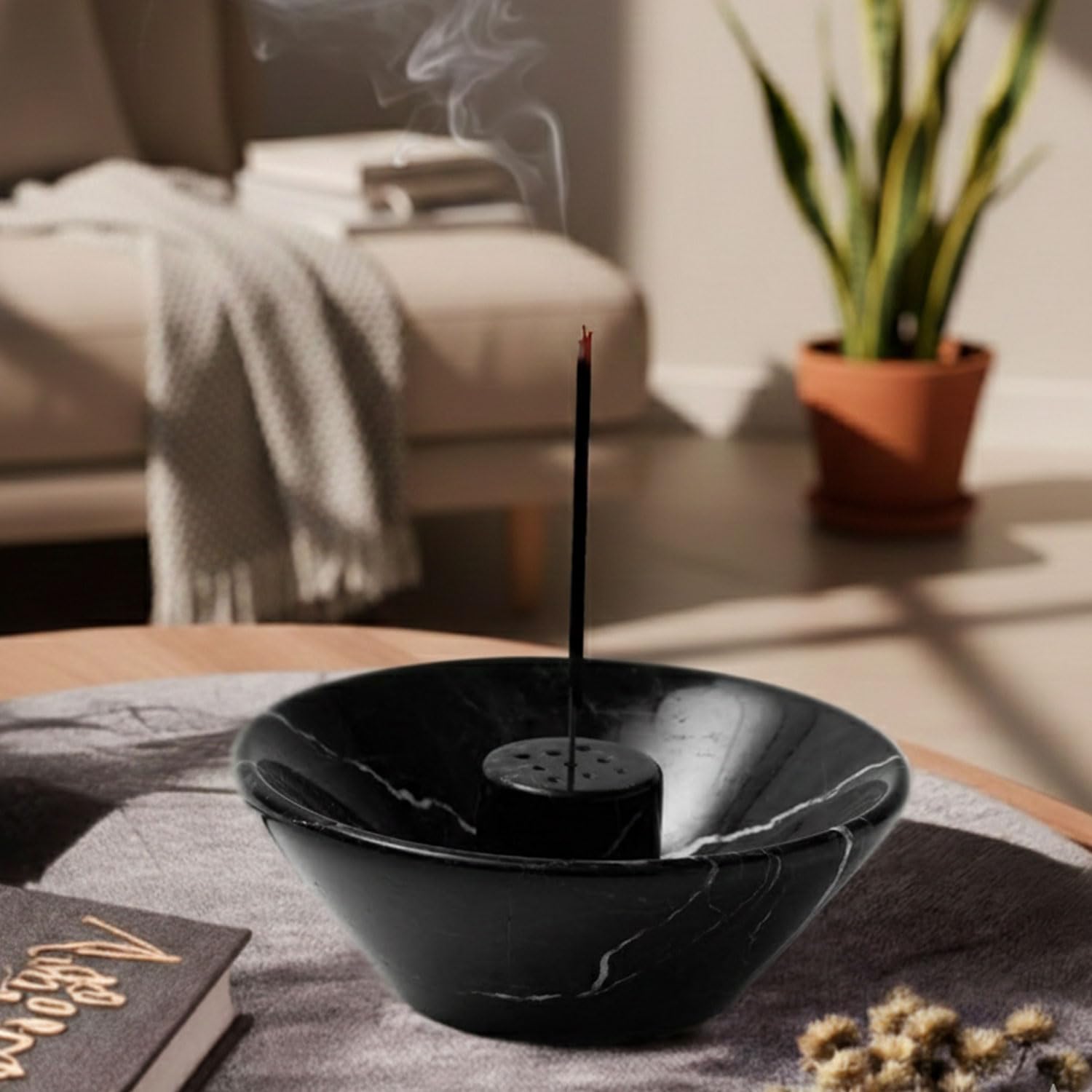 - MODERN AESTHETIC & DECORATION - With its sleek, minimalist profile, this incense burner holder serves as a sophisticated piece of decoration. Whether placed in a living room, spa, or office, the neutral stone tones blend seamlessly with any interior style.