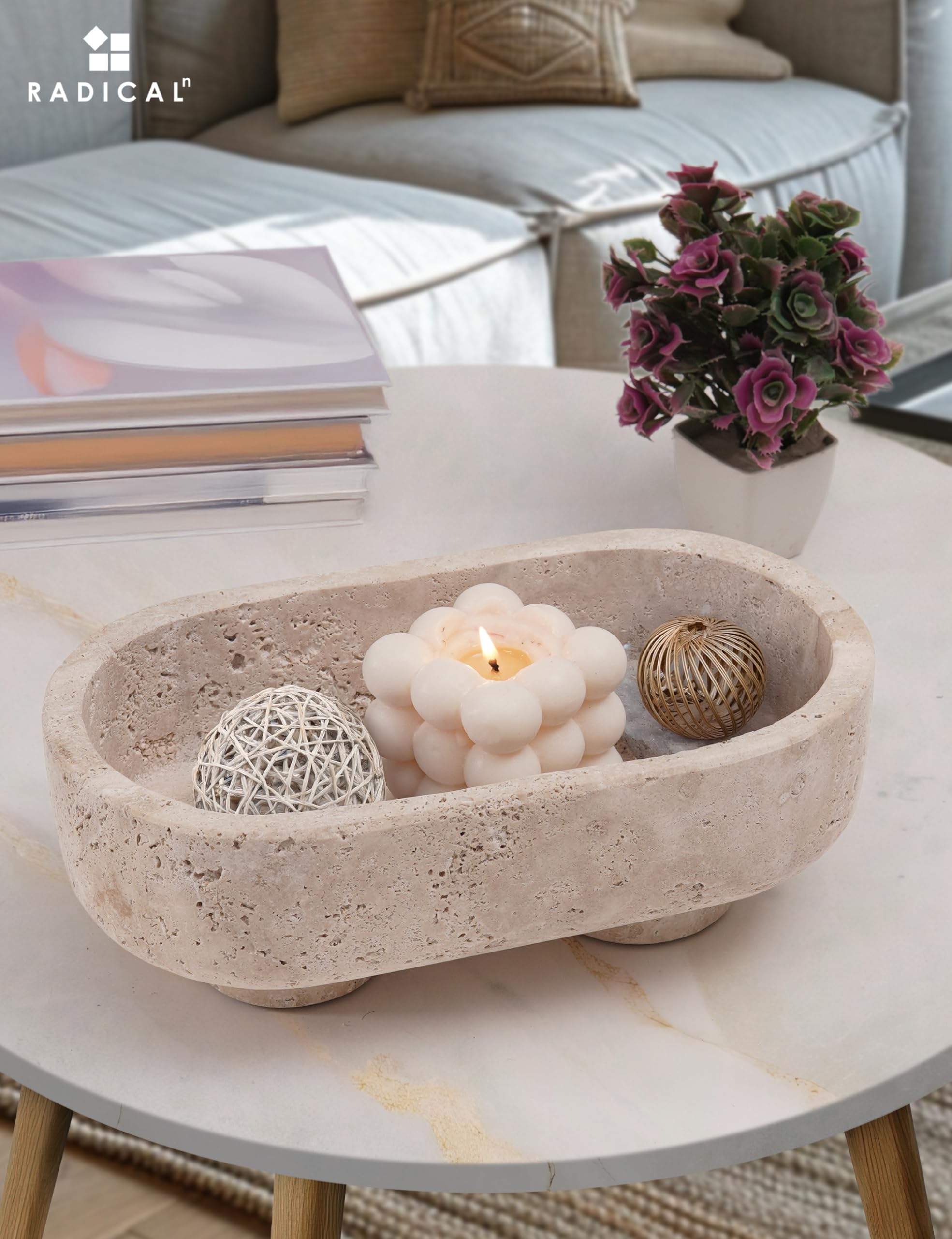 Radicaln Marble Oval Bowl With Stand 10" Inches Travertine Handmade Decorative Bowl, Ideal Key Bowl & Candle Holder, Candy and fruit Dish For Kitchen Countertop